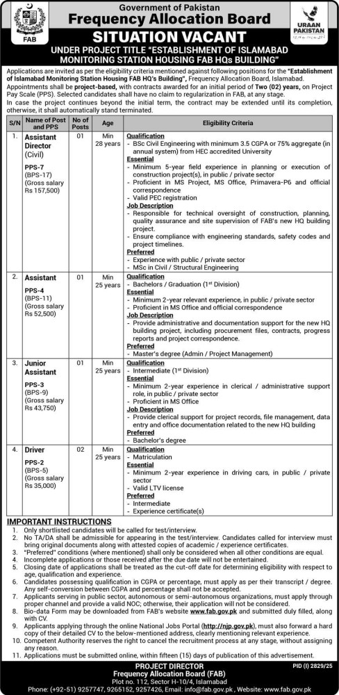 Situation Vacant Under project title Establishment of Islamabad Monitoring Station Housing FAB HQ,s Building